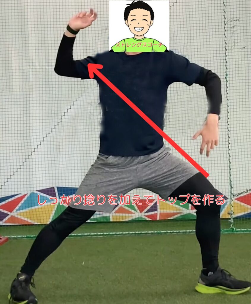 - 上半身をしっかり捻って、リリース前の“トップ”ポジションを作ります。